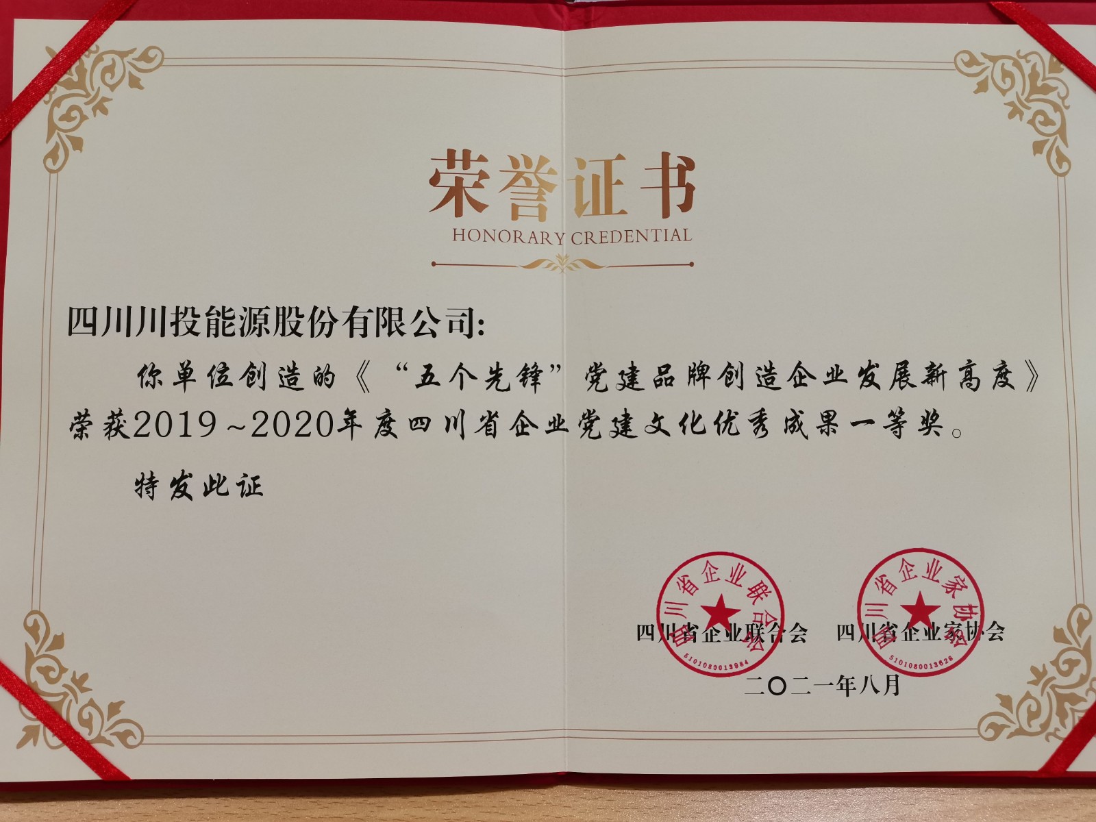 公司“五個先鋒”黨建品牌獲得2019-2020年度四川省企業(yè)黨建文化優(yōu)秀成果一等獎1