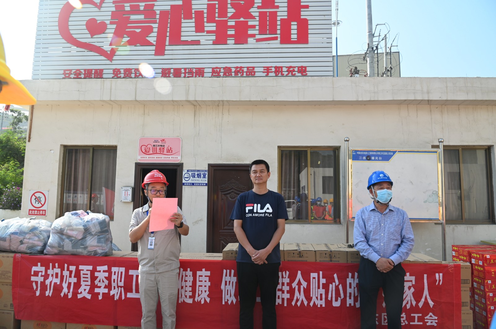 雖然是上午9點(diǎn),但盛夏的烈日已炙烤著銀江水電站工地。在銀江水電站“愛(ài)心驛站”,汪慶元首先致敬全體工友烈日下的“銀江精神”,高度贊揚(yáng)了一線建設(shè)者三年來(lái)為銀江水電站建設(shè)做出的積極貢獻(xiàn),并鼓勵(lì)他們要戰(zhàn)勝高溫酷暑等重重難關(guān),堅(jiān)守崗位完成工程建設(shè)任務(wù)。劉欣在講話中談到:東區(qū)工會(huì)心系工友,是大家的“娘家人”,希望大家保重身體,平安度夏,在落實(shí)安全防護(hù)的前提下積極工作,保質(zhì)保量推進(jìn)項(xiàng)目施工,為攀枝花的經(jīng)濟(jì)建設(shè)做出更大的貢獻(xiàn)。