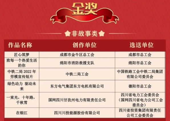 在熱烈慶祝黨的二十大勝利召開之際,由四川省總工會主辦的本次大賽受到了各地市州、央企、國企的熱烈追捧,選送故事類作品137部,非故事類作品685部。經(jīng)過初評初評,共有245部作品入圍終評。經(jīng)過專家評委的綜合評審,最終評選出故事類、非故事類作品金獎各6部、銀獎各8部、銅獎各12部,優(yōu)秀獎各25部。可謂百花齊放、精彩紛呈,競爭十分激烈。