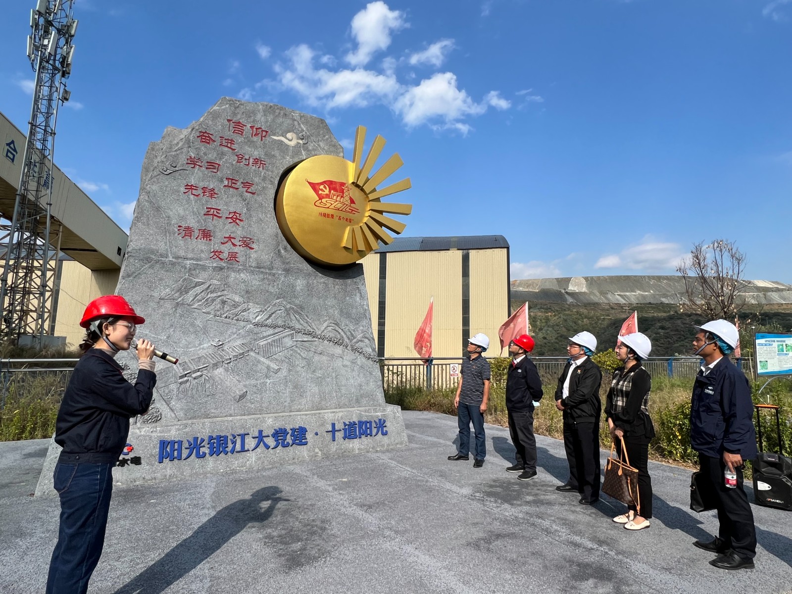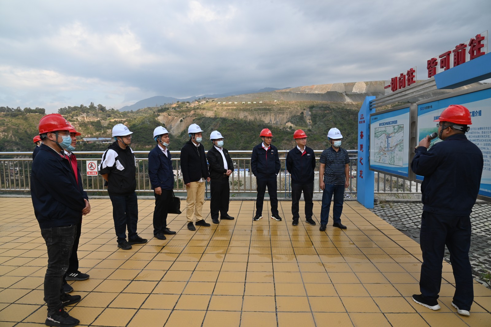 覃鳳荏一行首先來到銀江水電站施工現(xiàn)場(chǎng),參加了銀江水電站大壩首倉(cāng)混凝土澆筑活動(dòng)。在現(xiàn)場(chǎng)聽取了銀江水電站工程整體規(guī)劃、建設(shè)意義、工期計(jì)劃等基本情況介紹,并參觀了鋼筋加工車間、試驗(yàn)室等地。隨后,覃鳳荏一行參觀了攀水電公司“七色陽光大黨建”宣傳陣地,詳細(xì)了解了“十道陽光行動(dòng)計(jì)劃”等內(nèi)容。