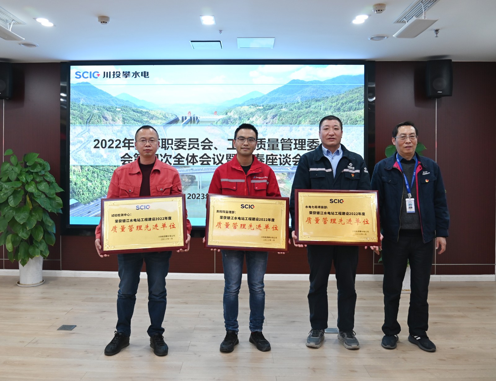 會(huì)上,公司黨總支副書(shū)記、董事會(huì)秘書(shū)、工會(huì)主席鄧勇宣讀了《關(guān)于表彰銀江水電站2022年度質(zhì)量管理先進(jìn)單位、先進(jìn)集體和先進(jìn)個(gè)人的通報(bào)》文件,徐孝剛向榮獲2022年度質(zhì)量管理先進(jìn)單位的試驗(yàn)檢測(cè)中心、貴陽(yáng)院監(jiān)理部、水電七局項(xiàng)目部頒發(fā)了獎(jiǎng)牌,公司總經(jīng)理助理兼工程管理部經(jīng)理嚴(yán)瑞平向先進(jìn)集體代表頒發(fā)了獎(jiǎng)牌。吳巍嶼組織參會(huì)人員向獲獎(jiǎng)的單位、集體及個(gè)人表示了祝賀,要求其在今后的質(zhì)量管理工作中發(fā)揮好先鋒模范帶頭作用,促進(jìn)各參建單位共同提高質(zhì)量管理水平,把銀江水電站建設(shè)成“精品工程、樣板工程、陽(yáng)光工程”。
