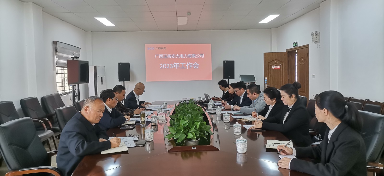 隨后,徐孝剛一行在桂平光伏電站升壓站二樓會議室召開了廣西農(nóng)光公司2023年工作會,會議由攀新能源公司公司、廣西農(nóng)光公司財務總監(jiān)王俊森主持,公司全體員工(兼職)、運維單位代表參加會議。會議學習傳達了川投集團、川投能源、攀新能源公司2023年工作會精神;覃鳳荏作了廣西農(nóng)光公司《2022年工作總結(jié)及2023年工作計劃》的報告,重點匯報了2022年度主要指標完成情況、主要工作舉措及成效、存在的問題和困難以及2023年工作打算等;王俊森代表公司領導班子作廉潔從業(yè)公開承諾;公司主要領導分別與部門代表簽訂了2023年《“雙廉”責任書》《部門目標責任書》。