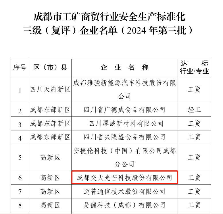 2024年9月,成都市應(yīng)急局發(fā)布《關(guān)于公布成都市工礦商貿(mào)行業(yè)安全生產(chǎn)標(biāo)準(zhǔn)化三級(jí)(復(fù)評(píng))企業(yè)名單(2024年第三批)的通知》,交大光芒通過安全生產(chǎn)標(biāo)準(zhǔn)化三級(jí)達(dá)標(biāo)復(fù)評(píng)。