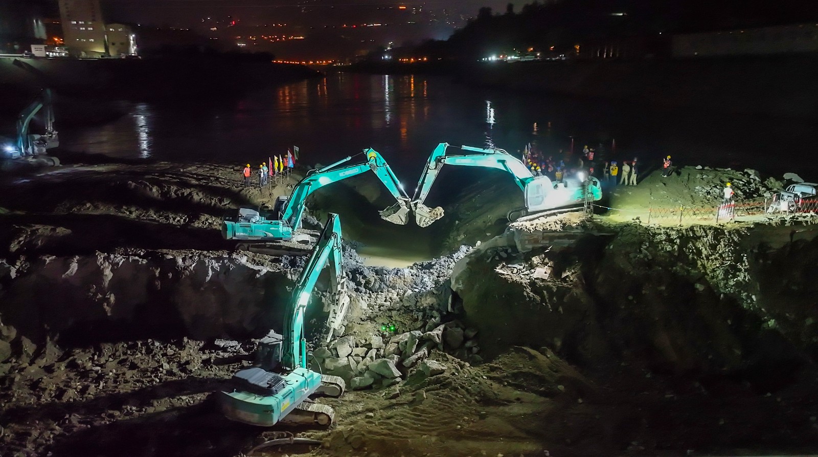 金秋十月,川投能源銀江水電站工程建設(shè)“進(jìn)度條”持續(xù)刷新。10月25日晚上,隨著川投能源副總經(jīng)理、導(dǎo)流明渠截流指揮長(zhǎng)徐孝剛一聲令下,十余臺(tái)挖掘機(jī)在二期上游圍堰右岸進(jìn)行破口開(kāi)挖,奔騰的金沙江水隨即涌入主河床廠房與溢流壩上游,充水平壓后江水經(jīng)溢流壩段流向下游,銀江水電站成功實(shí)現(xiàn)分流。這一重要進(jìn)展為按期完成導(dǎo)流明渠截流打下堅(jiān)實(shí)基礎(chǔ),也標(biāo)志著銀江水電站首臺(tái)機(jī)組投產(chǎn)發(fā)電正式進(jìn)入倒計(jì)時(shí)階段。