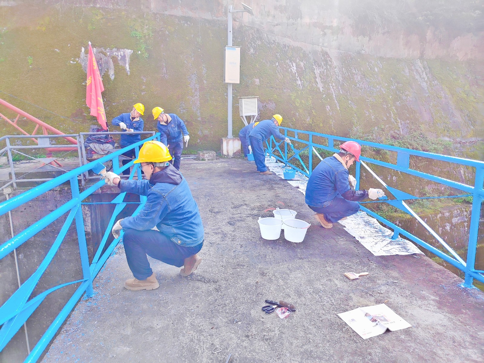 鳳鳴湖水庫是彭州市一級水源保護地。水庫大壩的護欄及金屬結構長期暴露于自然環(huán)境中,出現了不同程度的銹蝕脫漆現象,既影響大壩整體美觀,又對運行安全埋下隱患。為給大壩換上“新衣”,第三支部黨員擼起袖子迅速行動起來。
