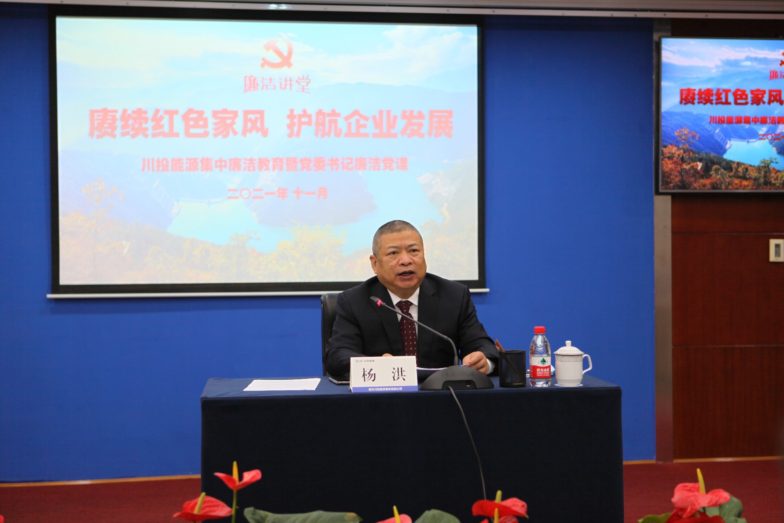 為貫徹落實中央關于全面從嚴治黨部署和要求,切實推進公司黨風廉政建設,推動“好風傳家”工作落實落細,2021年11月25日上午, 川投能源黨委組織召開了2021年集中廉潔教育會,公司黨委書記、副董事長、總經理楊洪以“賡續(xù)紅色家風,護航企業(yè)發(fā)展”為題給公司黨員干部講授廉潔黨課,并組織觀看了由中央紀委國家監(jiān)委宣傳部、中央廣播電視總臺聯(lián)合制作的電視專題片《正風反腐就在身邊》之《嚴正家風》。公司黨委副書記、工會主席冉蘭平主持會議。