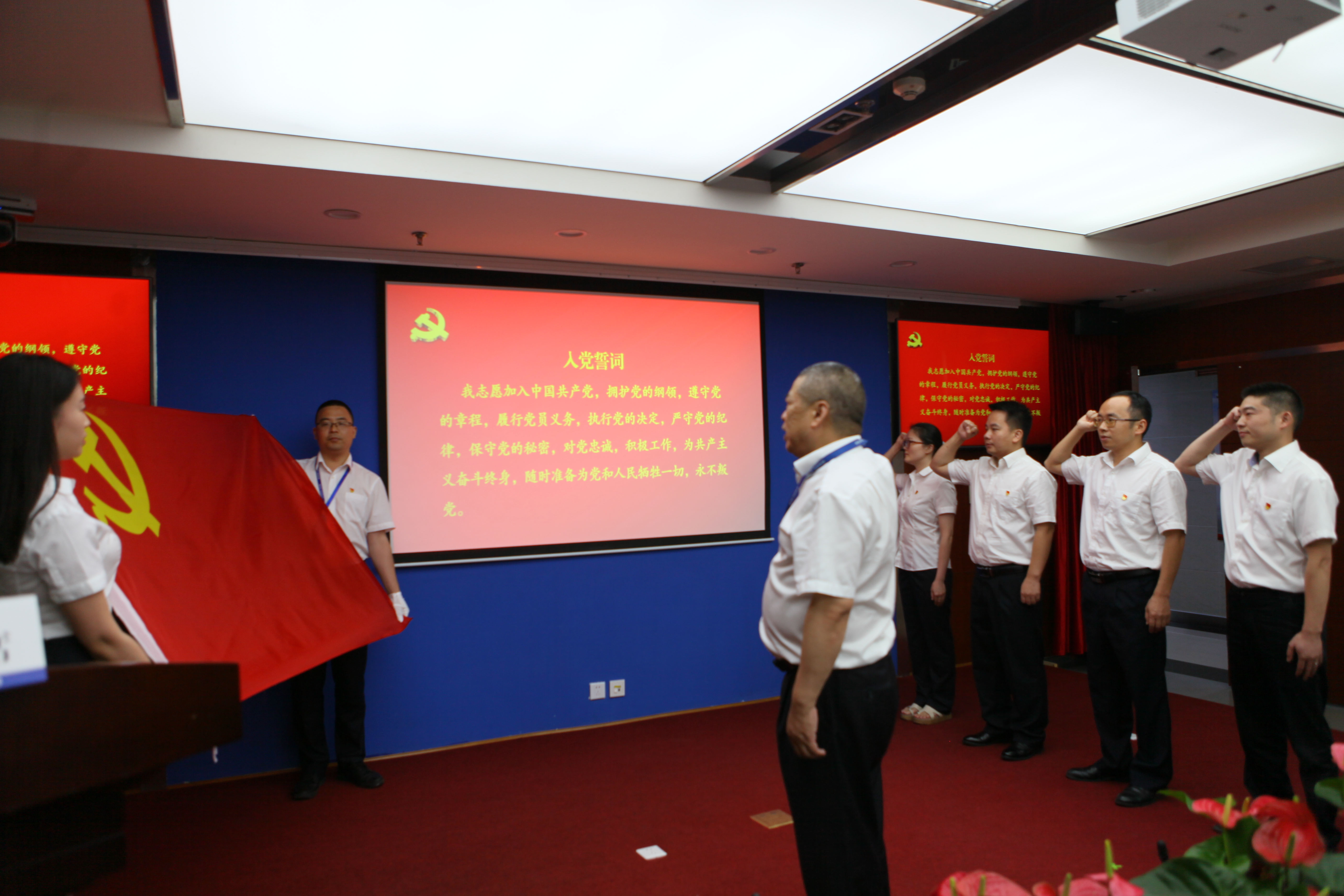 會議在雄壯的國歌中拉開序幕。與會黨員和新黨員代表在公司黨委書記、副董事長、總經(jīng)理楊洪同志的帶領(lǐng)下,舉起右拳,面向鮮紅的黨旗莊嚴(yán)宣誓。鏗鏘有力的誓言在耳邊久久回蕩,讓新老黨員進(jìn)一步堅定了入黨信念,增強(qiáng)了黨性意識,鞭策和激勵著大家履職盡責(zé)、干事創(chuàng)業(yè),以新氣象、新作為兌現(xiàn)對黨的莊嚴(yán)承諾。
